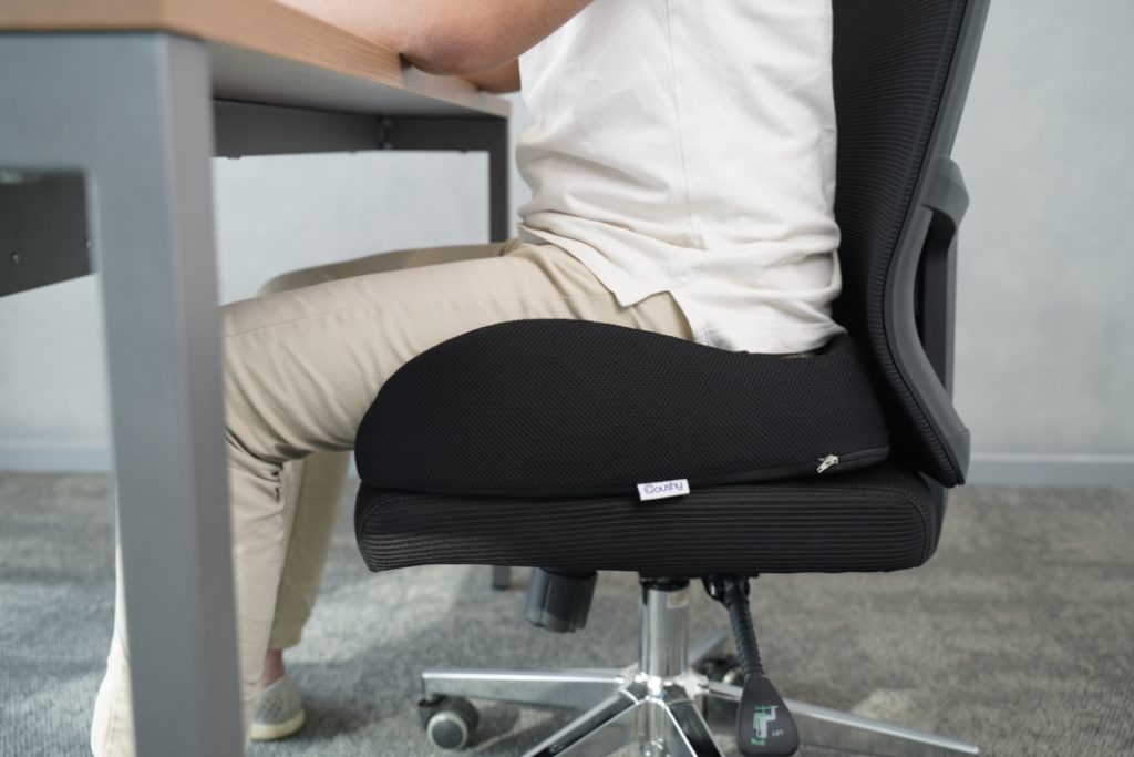 I sit at my desk here at home for hours reading and writing. I am 64. I noticed about a year ago that this sitting activity was causing me most unwelcome hip pain only on my right side. So I looked online, found the Coushy to be highly rated so I ordered one. No more hip pain or lower back fatigue. I now carry my cushion around the house and use it everywhere. I would like to use it in various vehicles that I drive at home and for work, but I am 6’6″ and space is a premium. Very satisfied with this PERFECT solution.